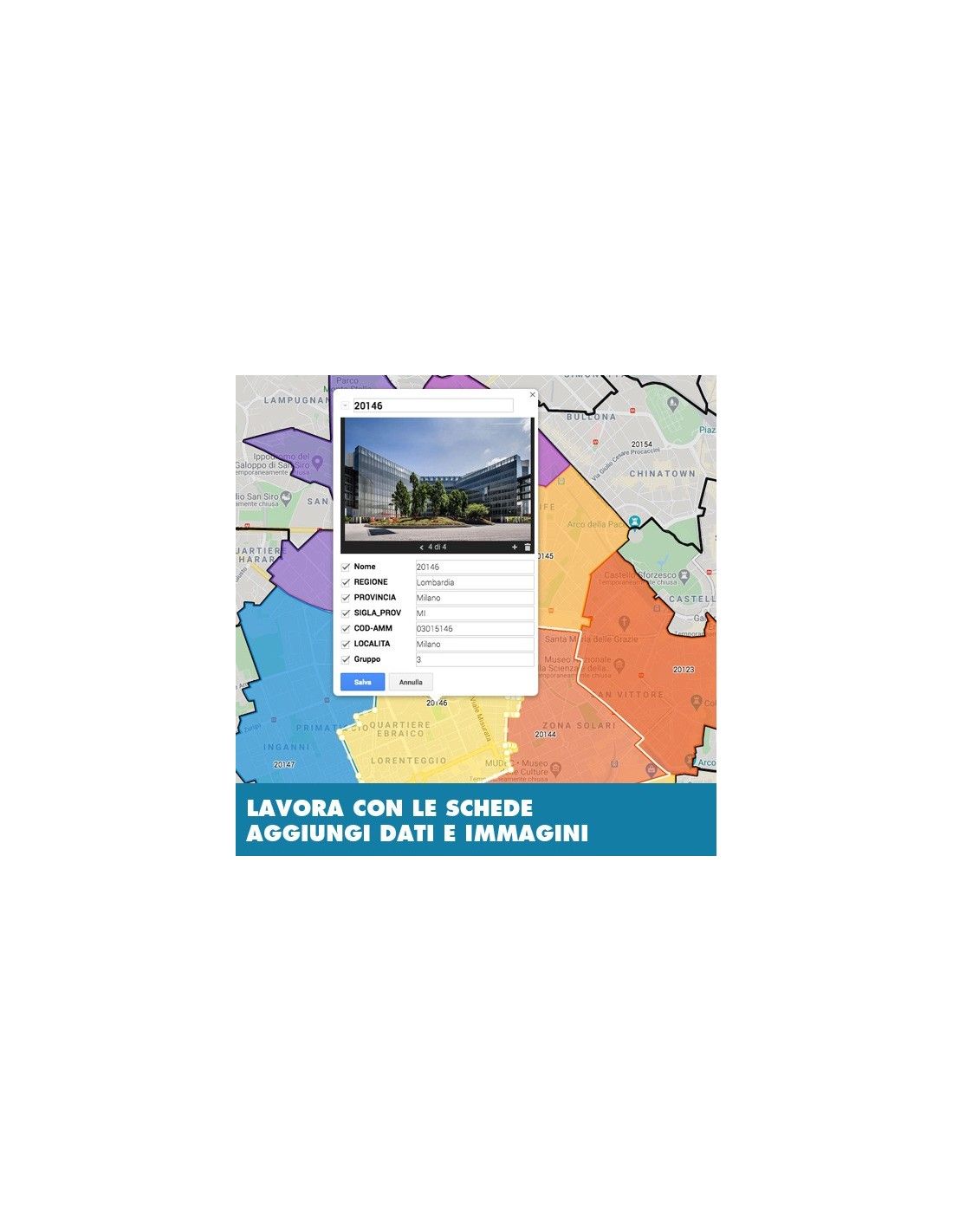 Con pochi semplici passaggi puoi importare le aree dei comuni, memorizzarle nella tua libreria di mappe e visualizzarle in sovrapposizione ad una delle tante viste disponibili su Google Maps: stradale, satellite, terreno e tante altre ancora. Personalizza le mappe dei comuni con i tuoi colori e condividi il risultato delle tue analisi via web!