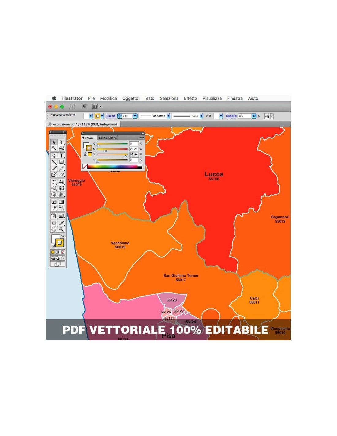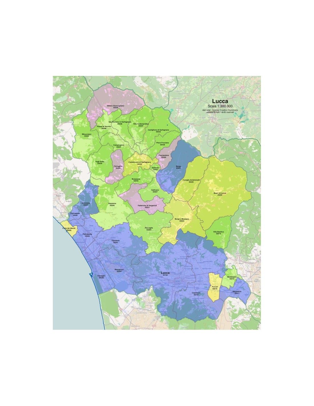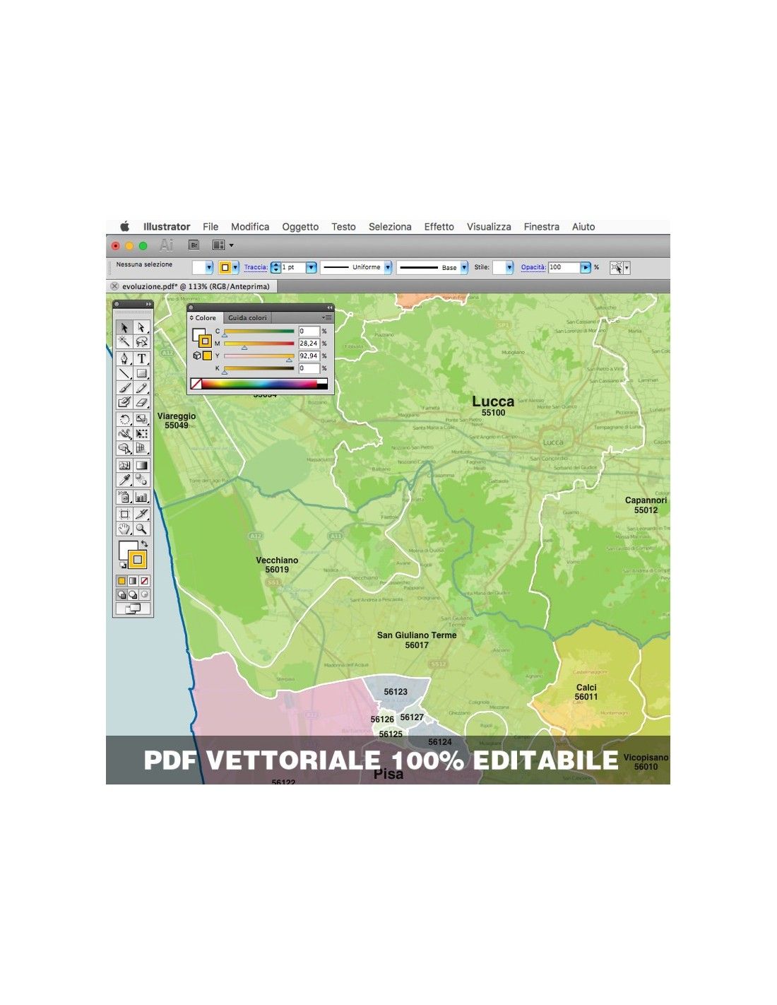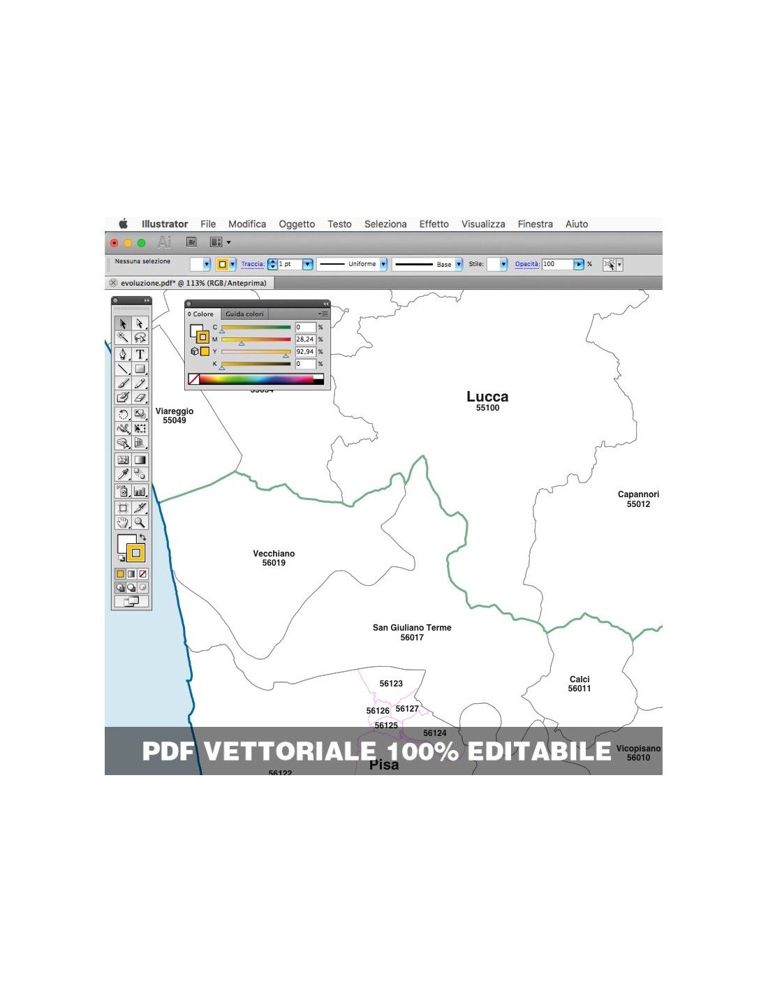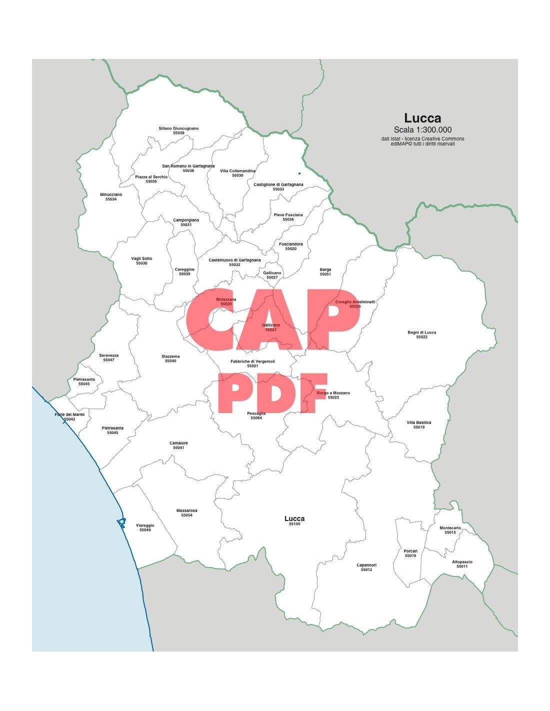 Mappa dei comuni con CAP della provincia di Lucca formato pdf scala 1:300.000. Tracciati modificabili.