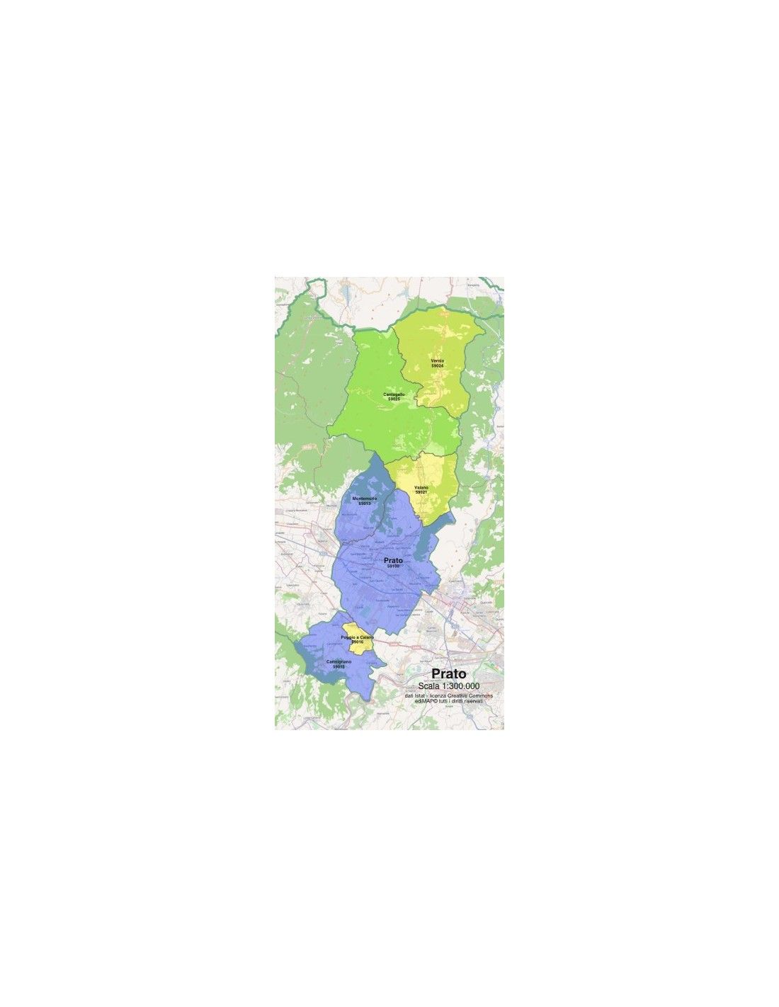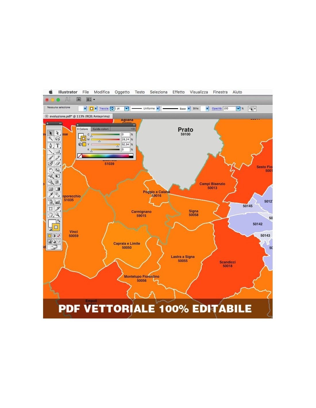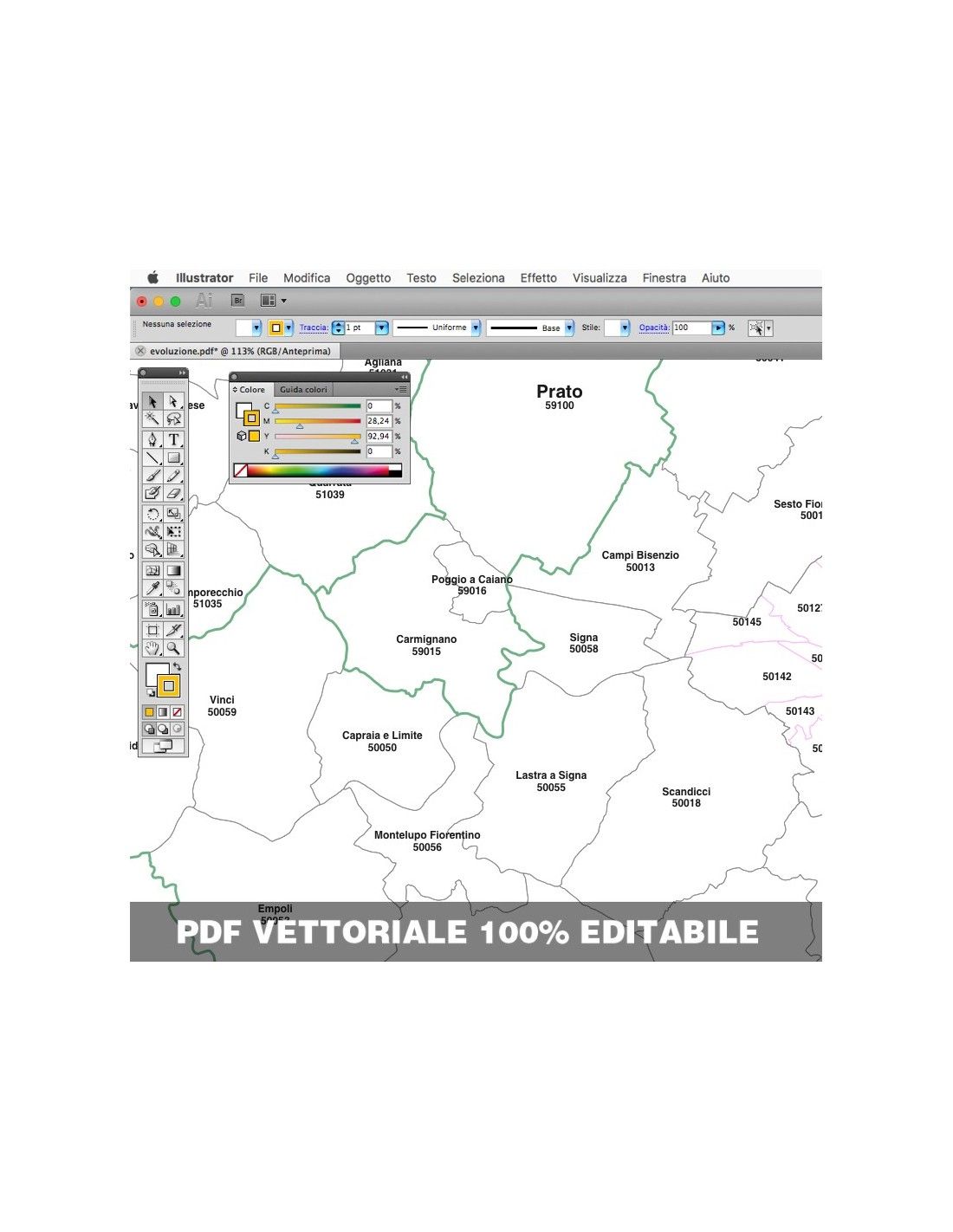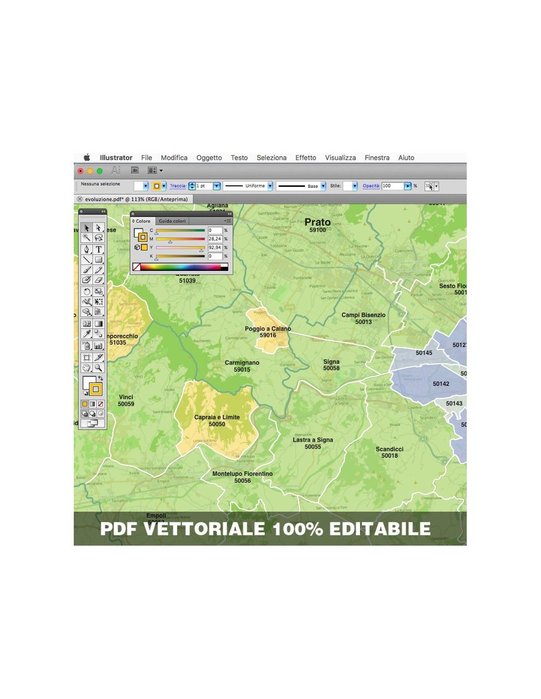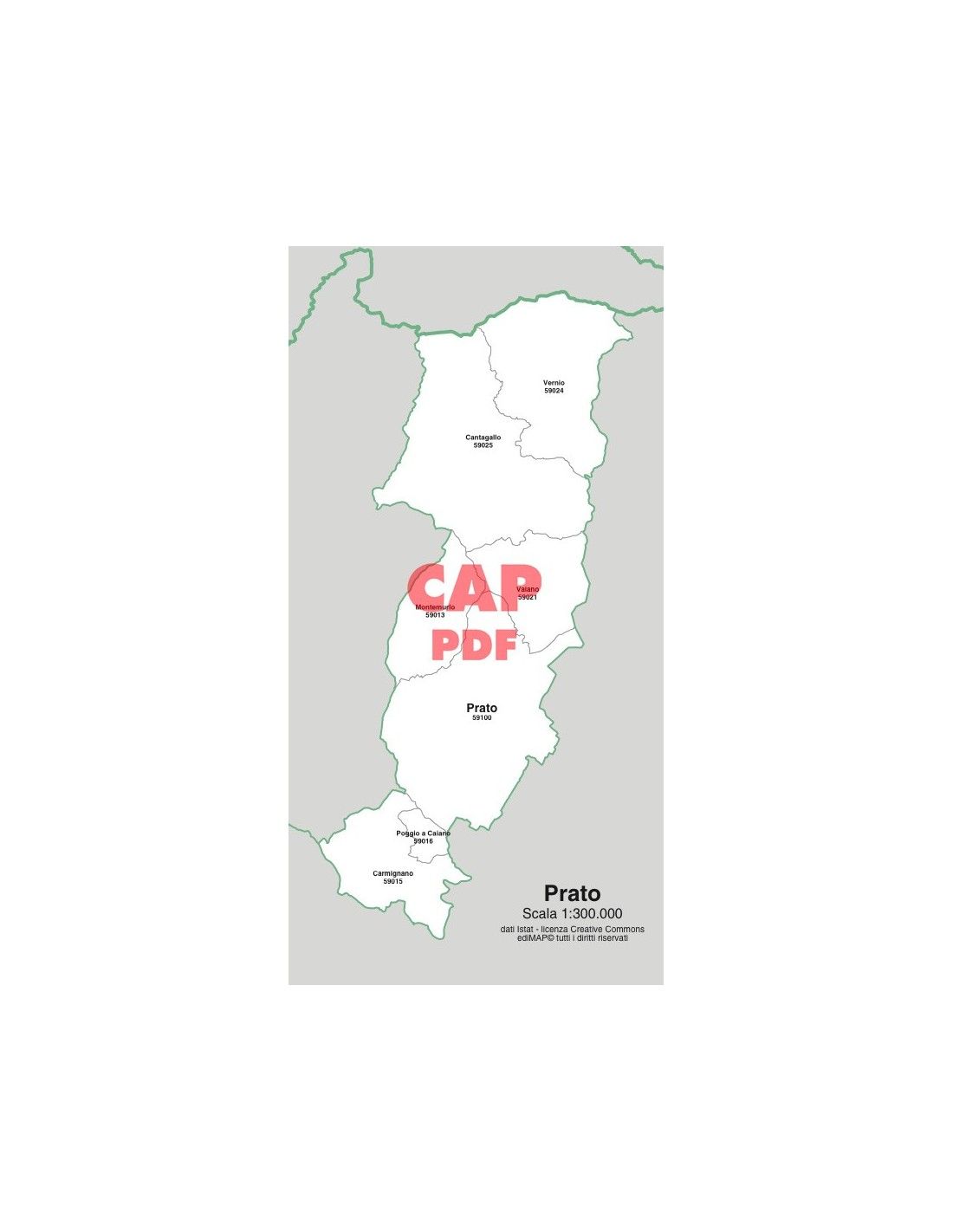 Mappa dei comuni con CAP della provincia di Prato formato pdf scala 1:300.000. Tracciati modificabili.