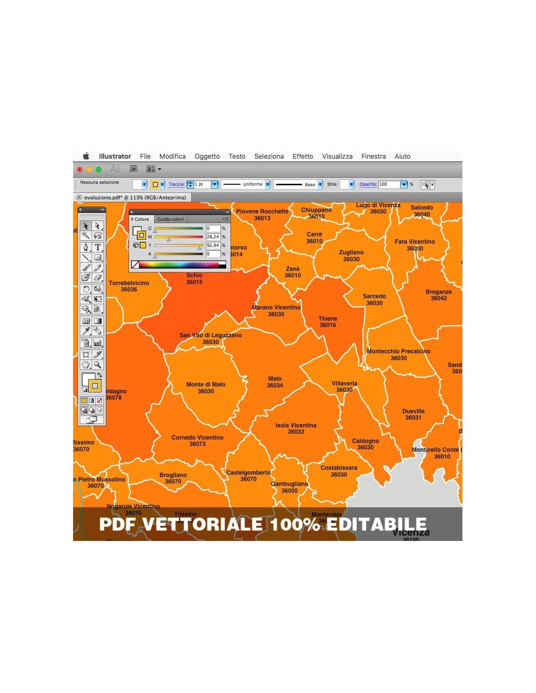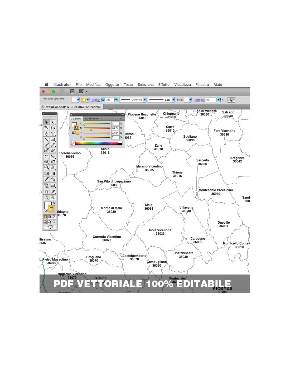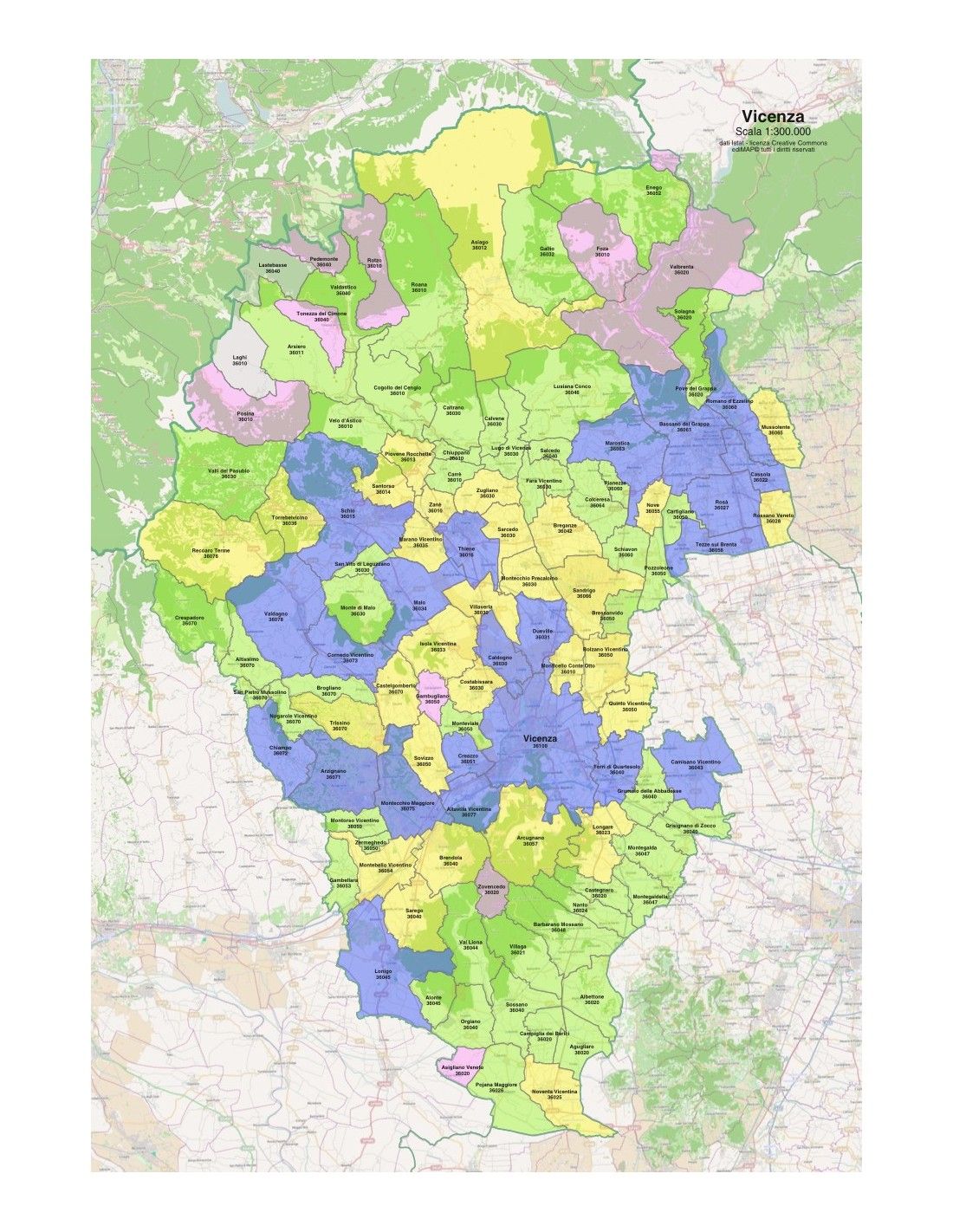 Mappa dei comuni con CAP della provincia di Vicenza formato pdf scala 1:300.000. Tracciati modificabili.