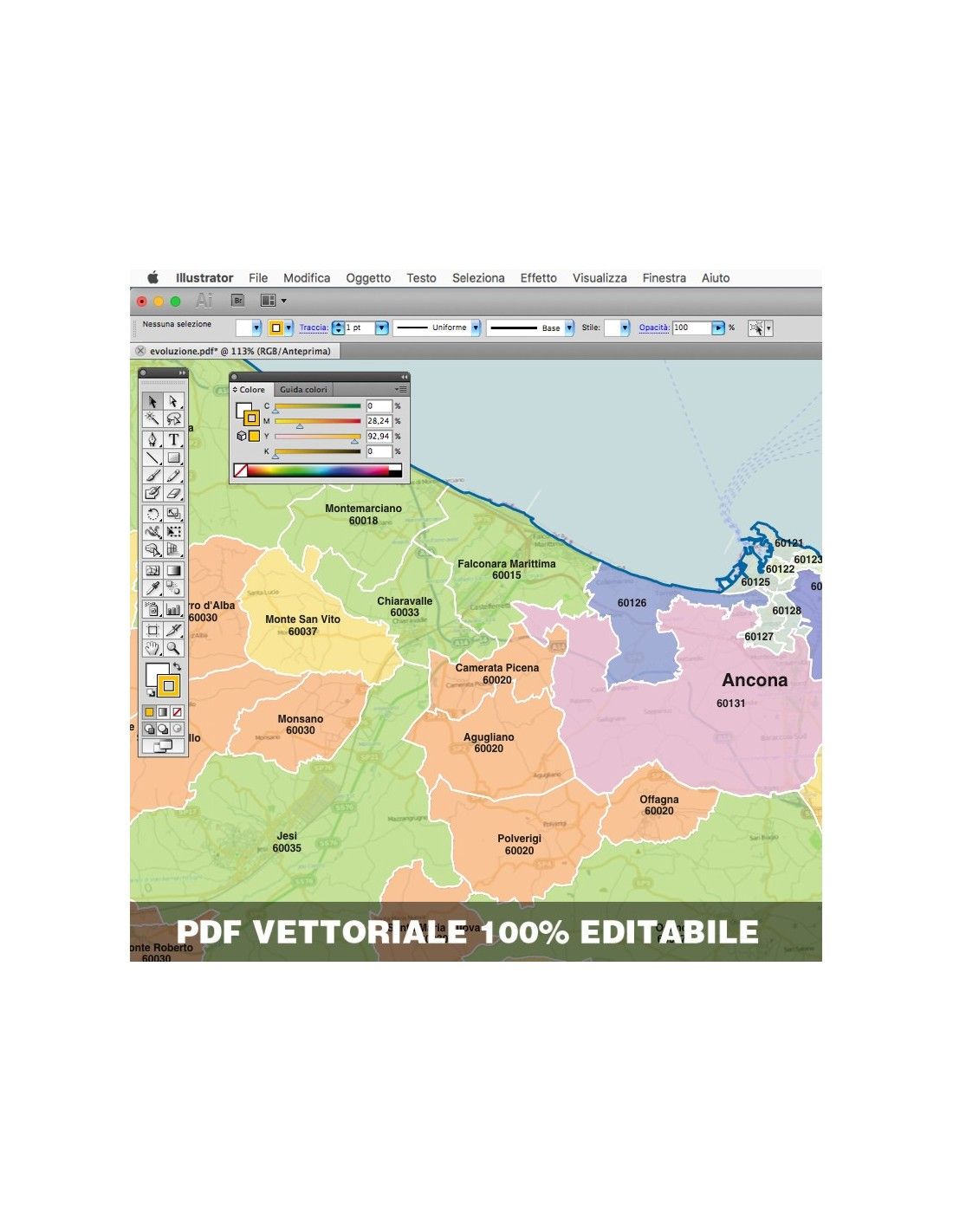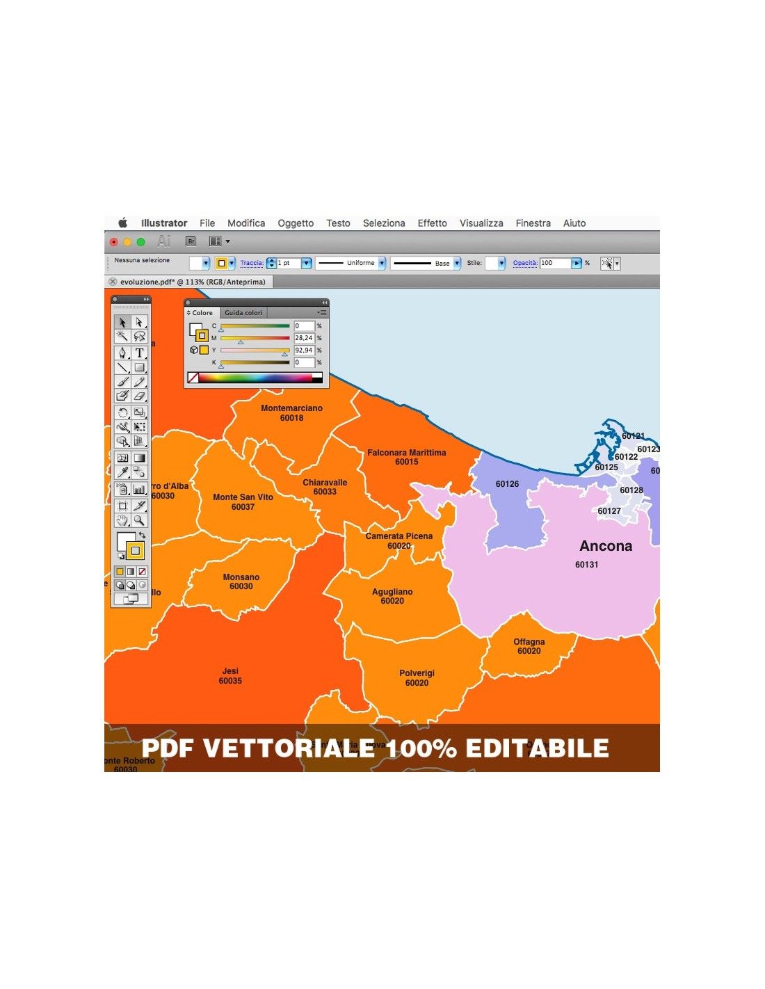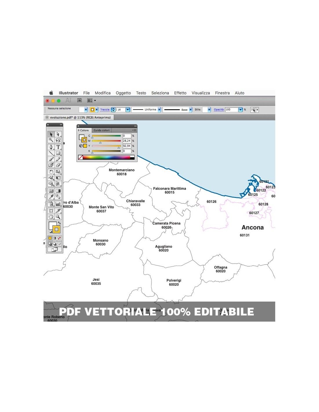 Mappa dei comuni e CAP della Marche in formato pdf vettoriale con tracciati e testi modificabili in Adobe Illustrator.