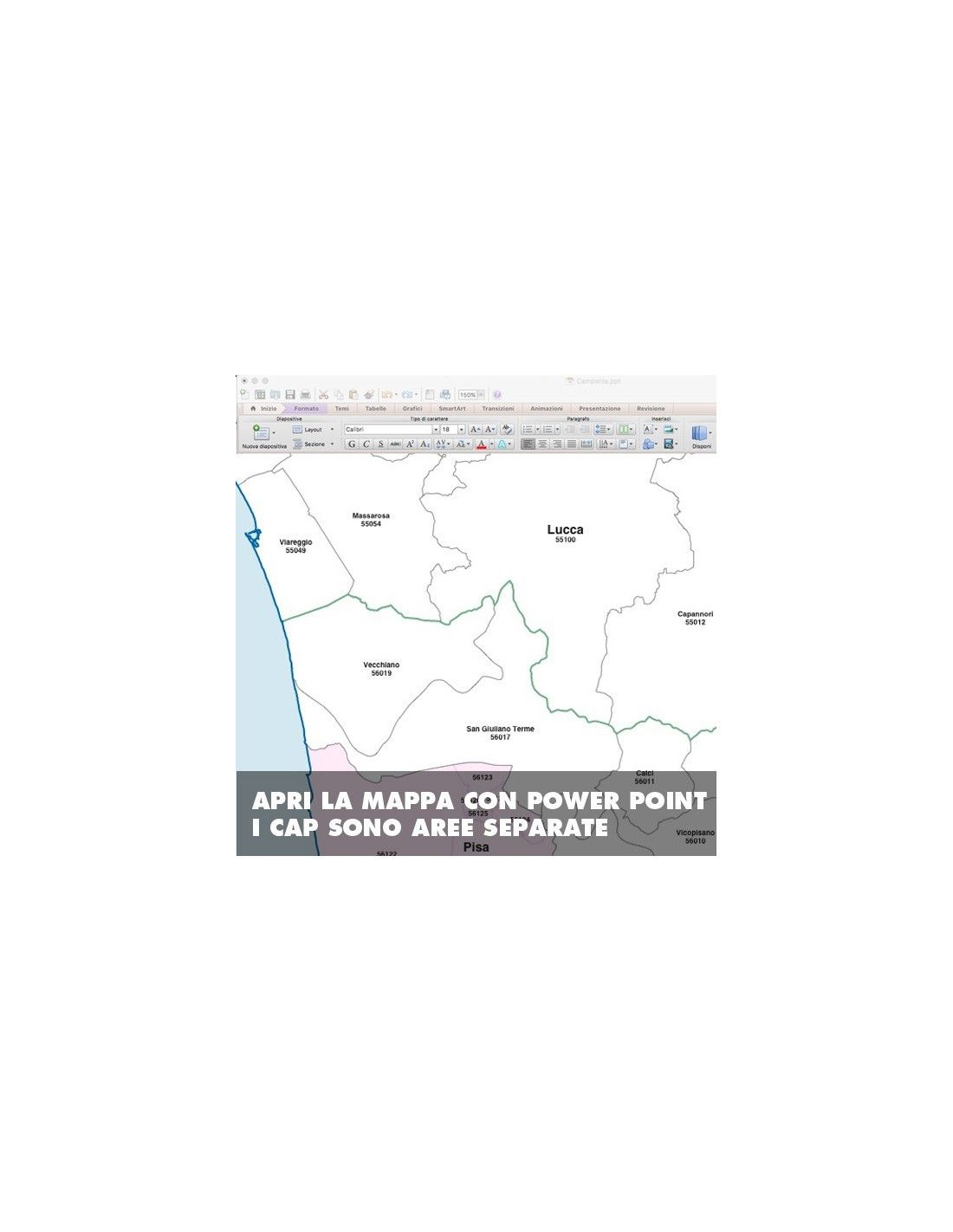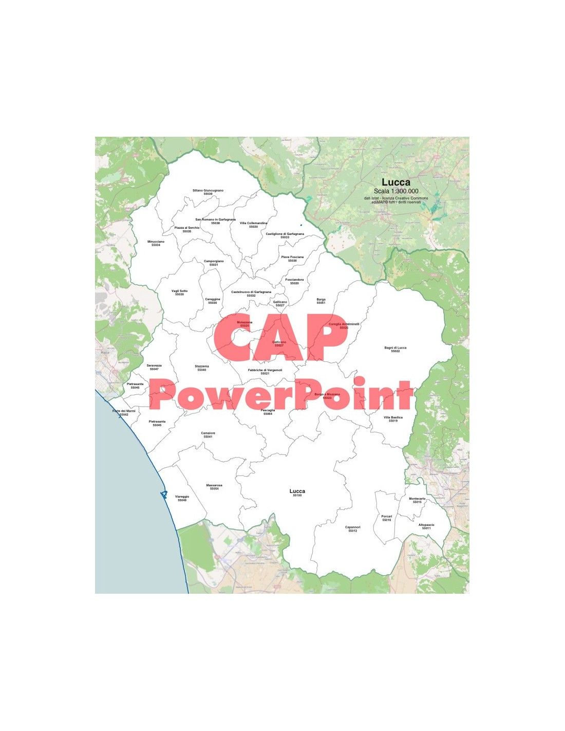 Mappa dei comuni con CAP della provincia di Lucca formato PowerPoint scala 1:300.000. Tracciati modificabili.