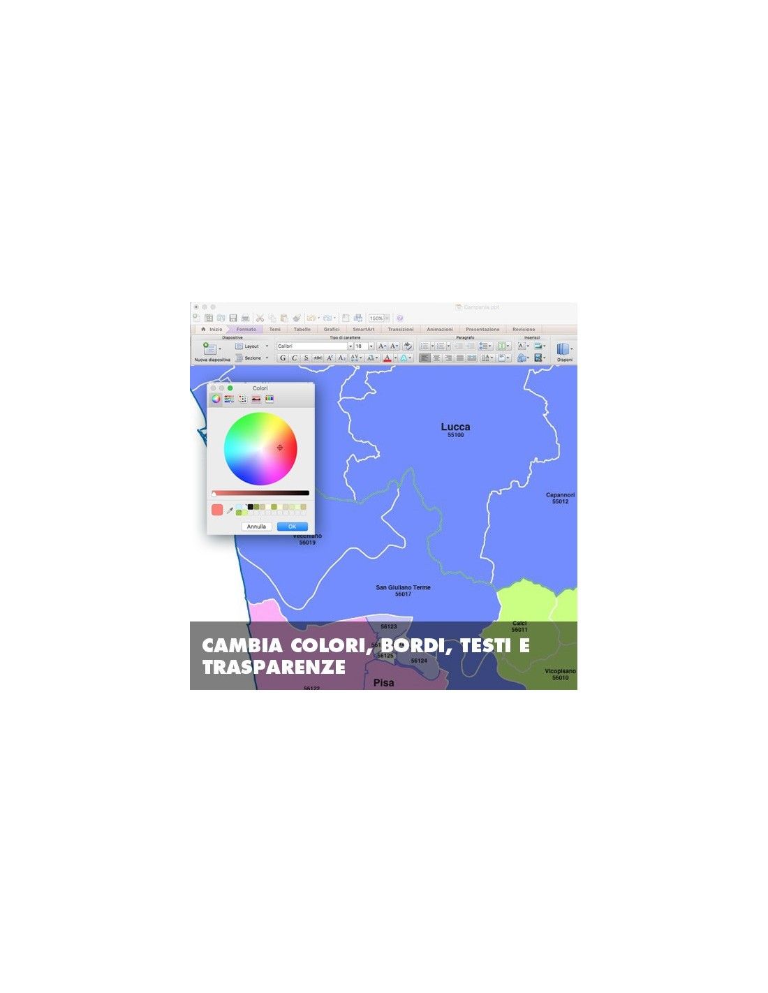 Seleziona un'area e fai clic sulla palette dei colori. Raggruppa i comuni per creare zone omogenee, aggiungi simboli e tratteggi, racconta la tua storia arricchendola con grafici, animazioni, transizioni e note personali. Sprigiona la tua creatività!