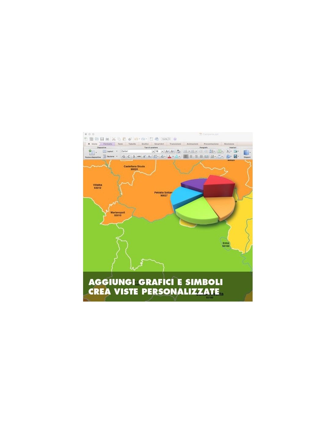 Seleziona un'area e fai clic sulla palette dei colori. Raggruppa i comuni per creare zone omogenee, aggiungi simboli e tratteggi, racconta la tua storia arricchendola con grafici, animazioni, transizioni e note personali. Sprigiona la tua creatività!