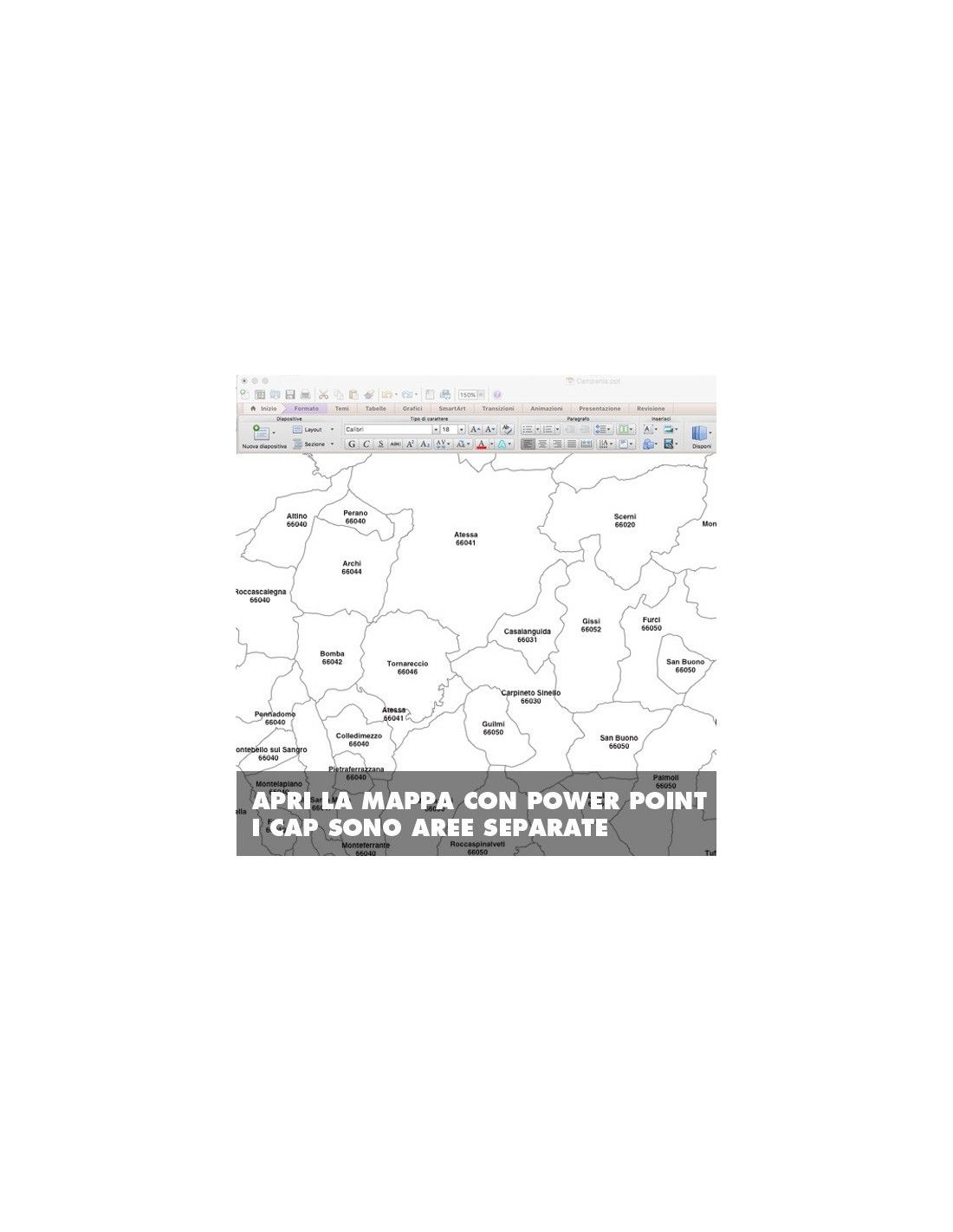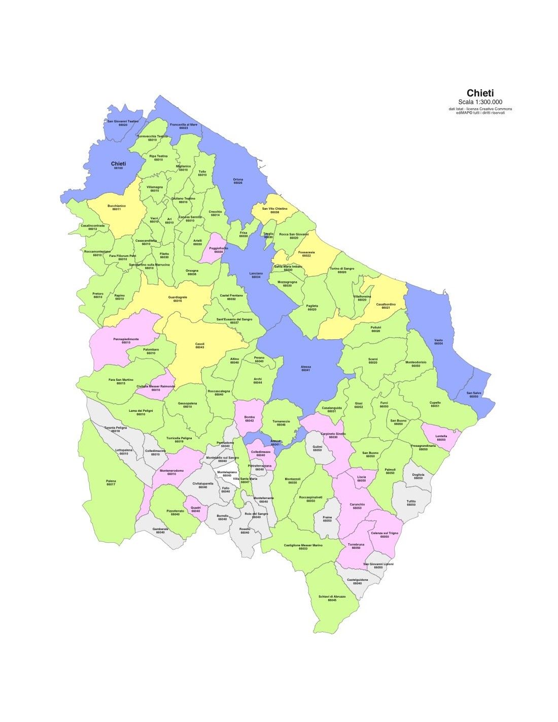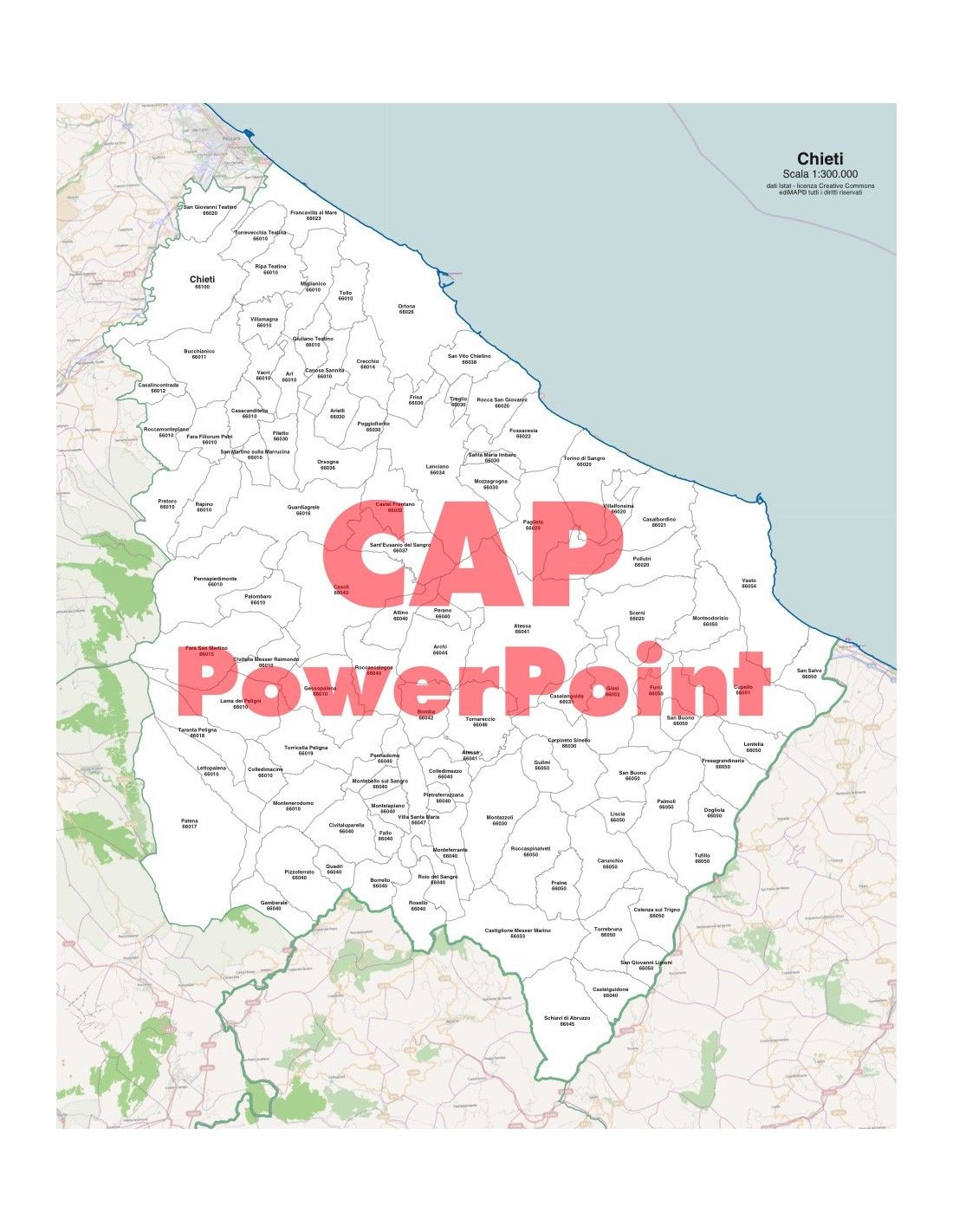 Mappa dei comuni con CAP della provincia di Chieti formato PowerPoint scala 1:300.000. Tracciati modificabili.