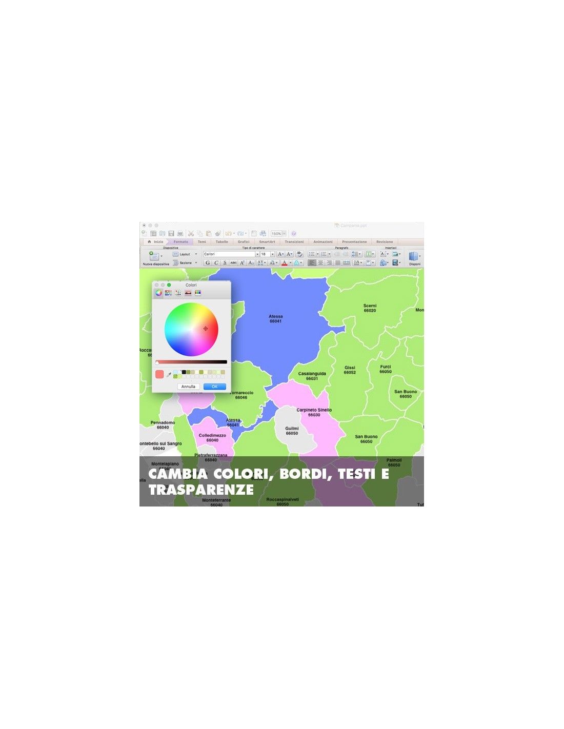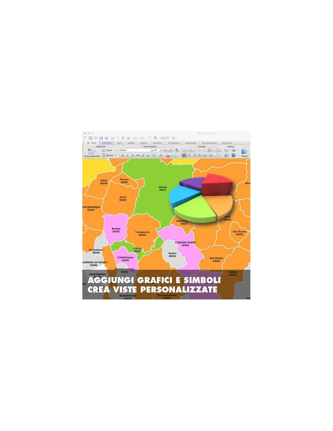 Seleziona un'area e fai clic sulla palette dei colori. Raggruppa i comuni per creare zone omogenee, aggiungi simboli e tratteggi, racconta la tua storia arricchendola con grafici, animazioni, transizioni e note personali. Sprigiona la tua creatività!