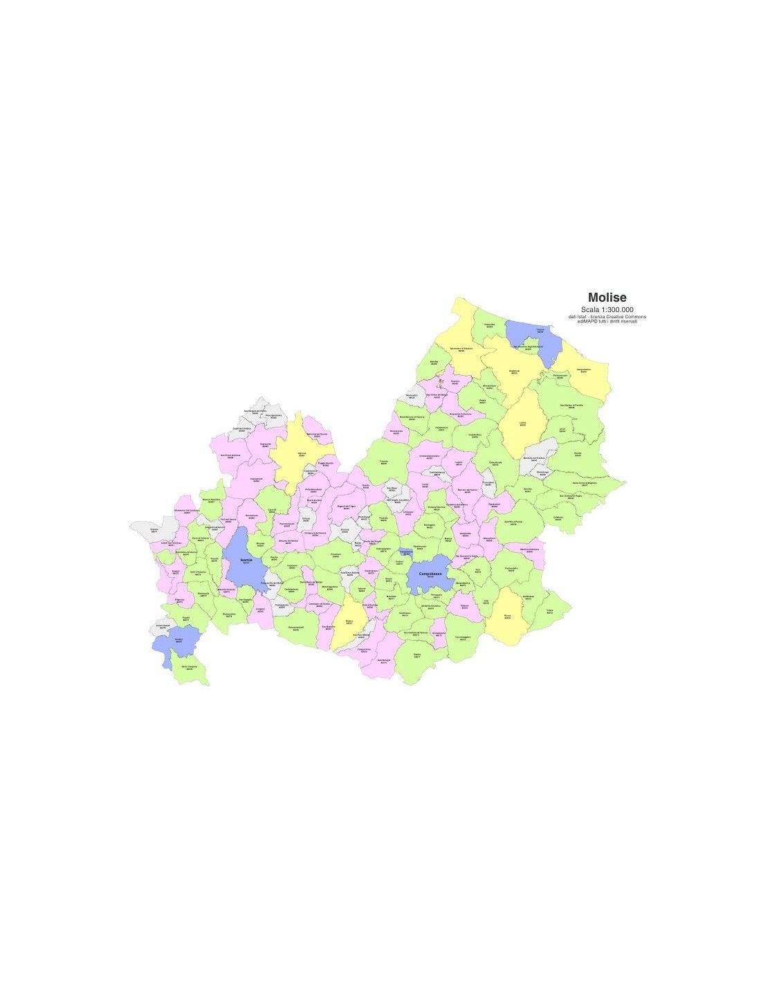 Mappa dei comuni con CAP del Molise in formato PowerPoint vettoriale con tracciati e testi modificabili in Adobe Illustrator.