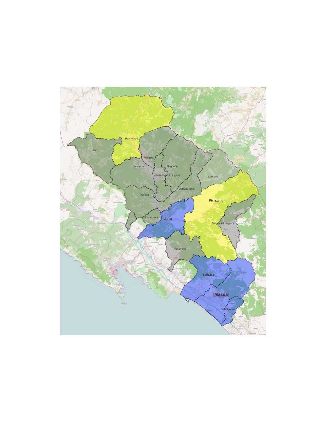 Mappa dei comuni della provincia di Massa-Carrara, formato KML per visualizzare i contenuti sulla piattaforma di GoogleEarth™. Colori e dati modificabili.