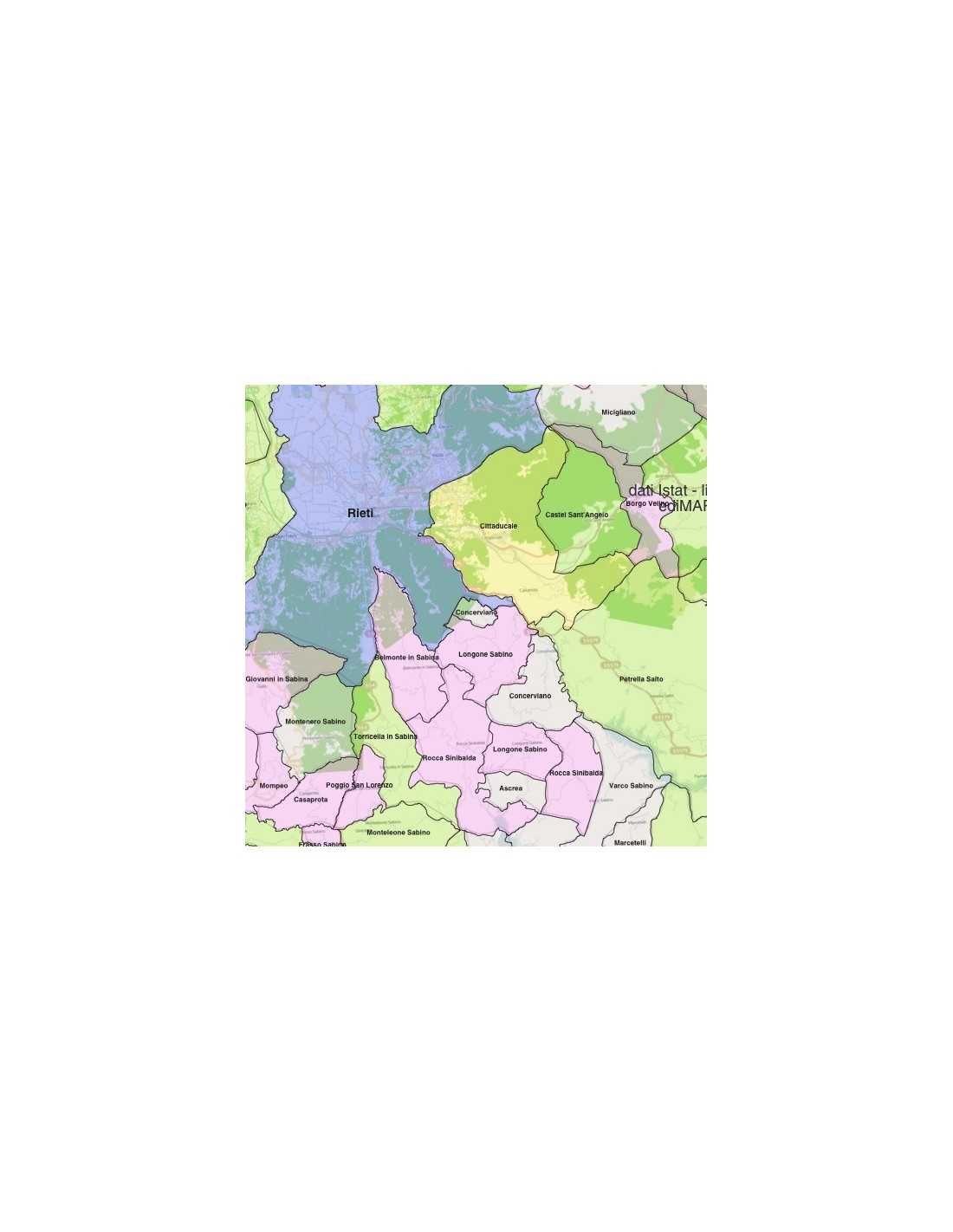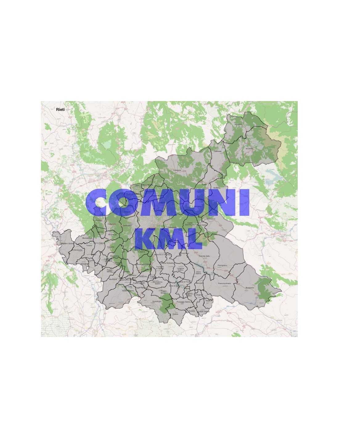 Mappa dei comuni della provincia di Rieti, formato KML per visualizzare i contenuti sulla piattaforma di GoogleEarth™. Colori e dati modificabili.