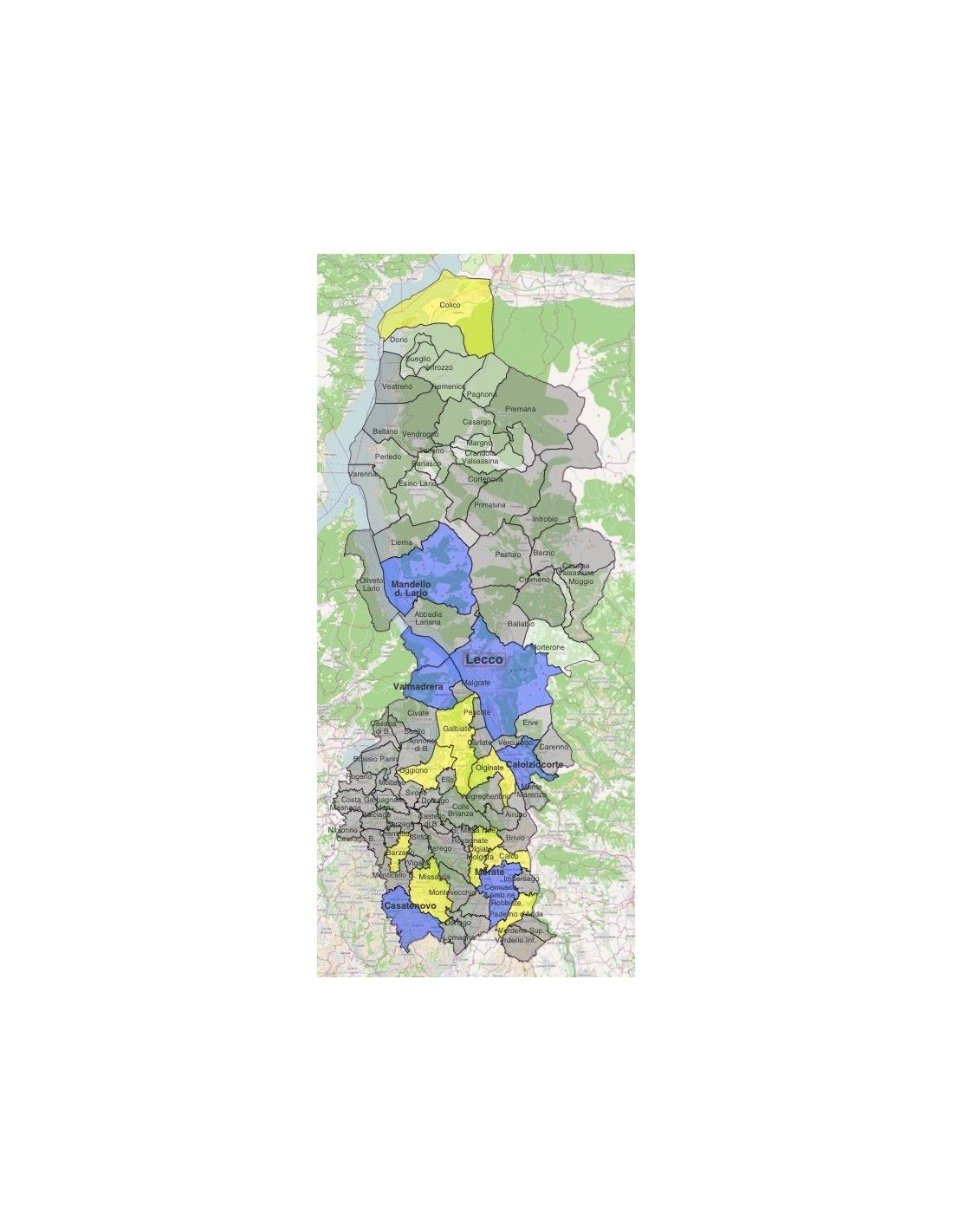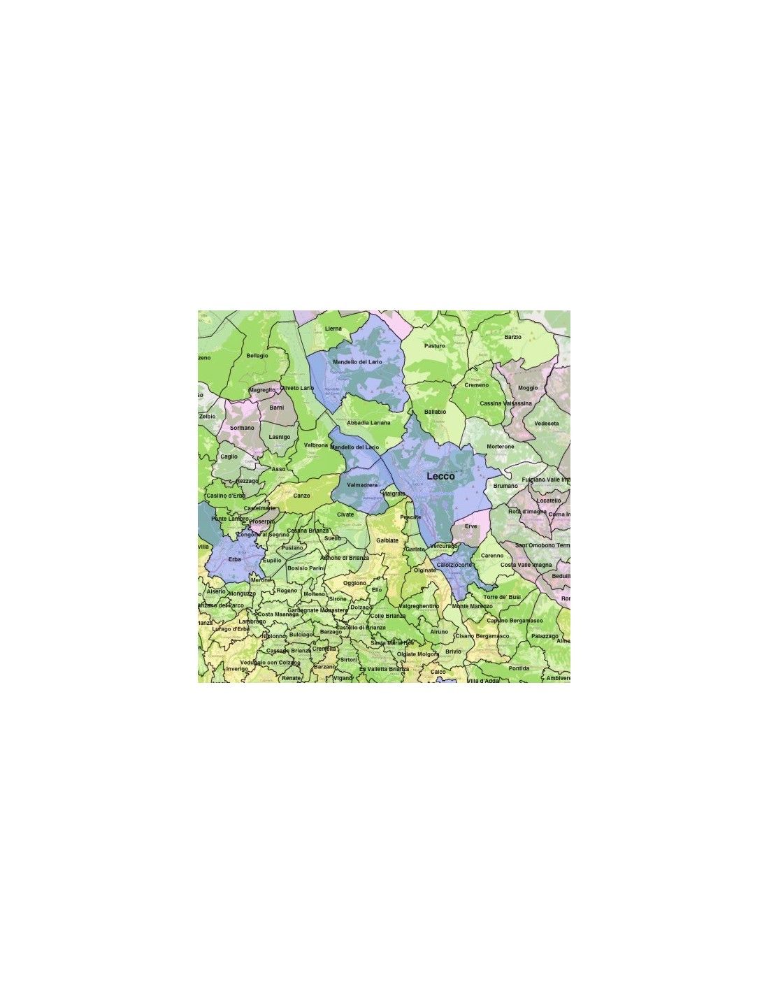Mappa dei comuni della provincia di Lecco, formato KML per visualizzare i contenuti sulla piattaforma di GoogleEarth™. Colori e dati modificabili.