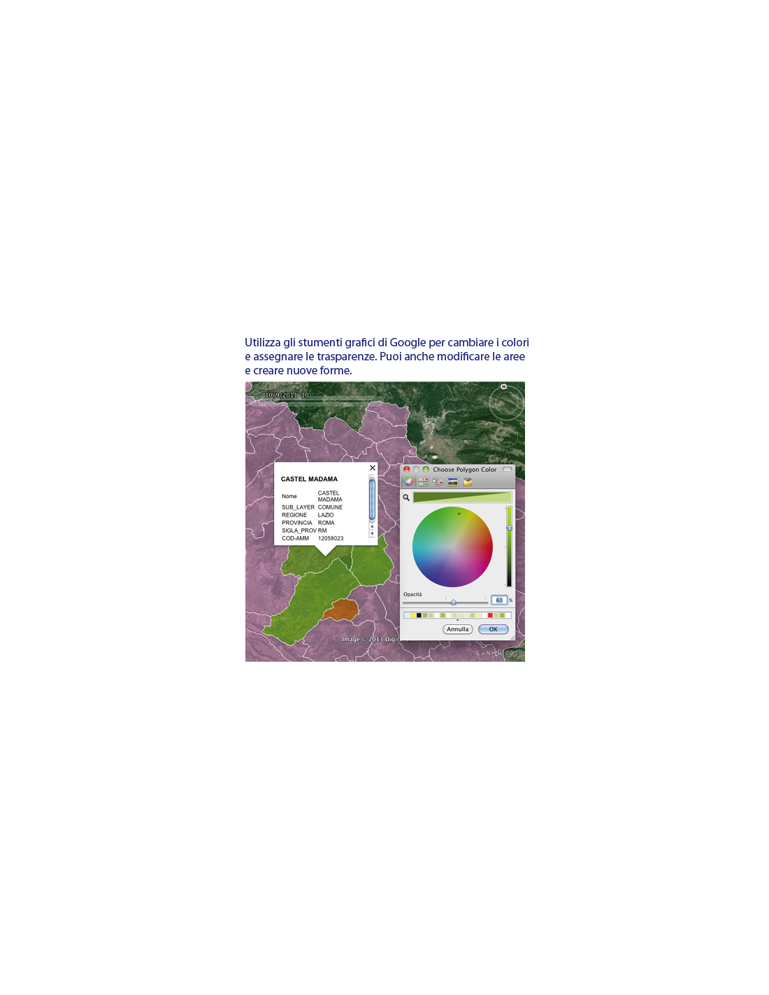 Con pochi semplici passaggi puoi importare le aree dei comuni, memorizzarle nella tua libreria di mappe e visualizzarle in sovrapposizione ad una delle tante viste disponibili su Google Maps: stradale, satellite, terreno e tante altre ancora. Personalizza le mappe dei comuni con i tuoi colori e condividi il risultato delle tue analisi via web!