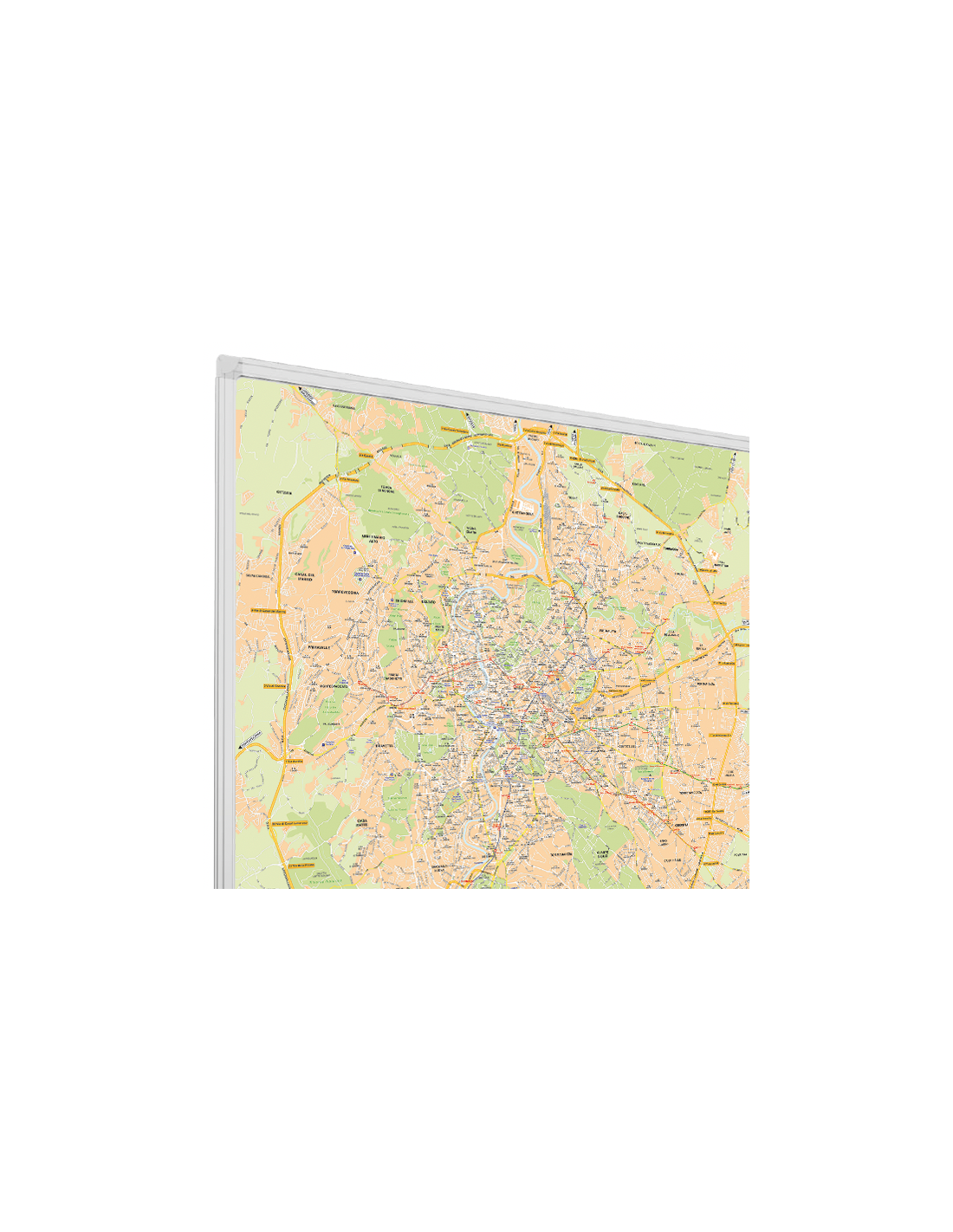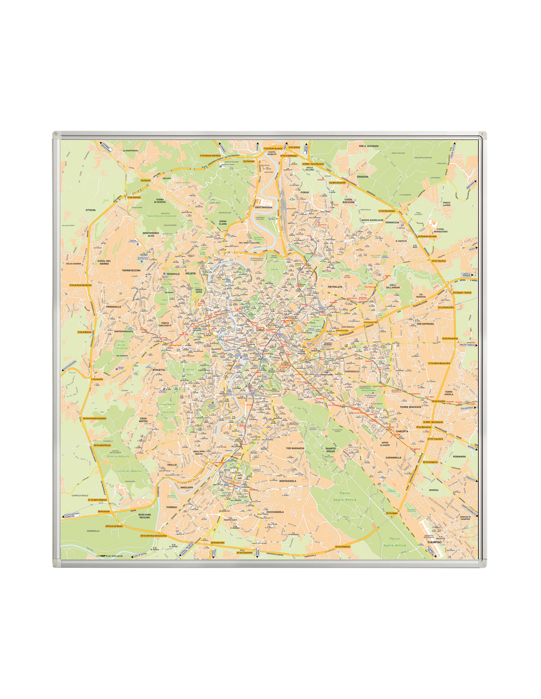 La mappa di Roma con tutto il Grande Raccordo Anulare in scala 1:14.000.Stampa diretta in altissima risoluzione su pannello rigido ultraleggero, con colori brillanti e durata per interni illimitata. Dimensioni 160x160 cm. Disponibile anche in versione con con Zone CAP, Municipi o QuartieriSpedizione inclusa.
