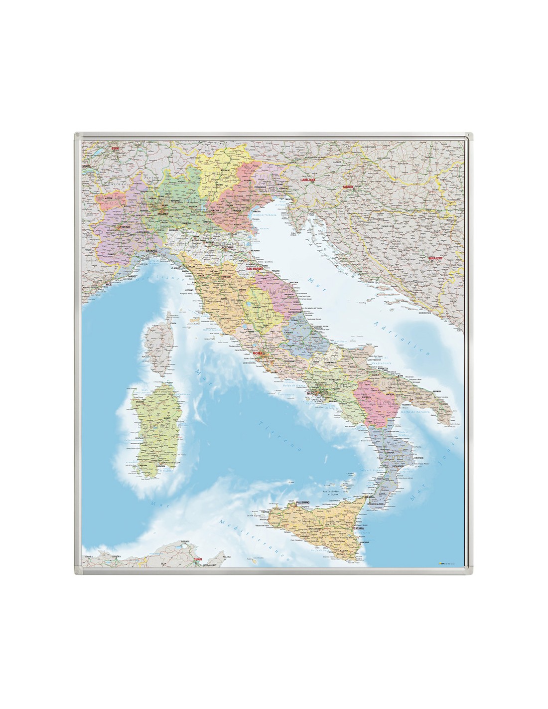 Mappa dell'Italia MAGNETICA VERSIONE "MARKET" SU BASE IN METALLO, dimensioni 120 x 135 cm. - Lavagna magnetica- Superficie in metallo- Utilizzabile con magneti di qualsiasi dimensione- Cornice in alluminio anodizzato colore argento, angoli di protezione in plastica- Kit per fissaggio a muro- Colori brillanti e durata per interni praticamente illimitata....