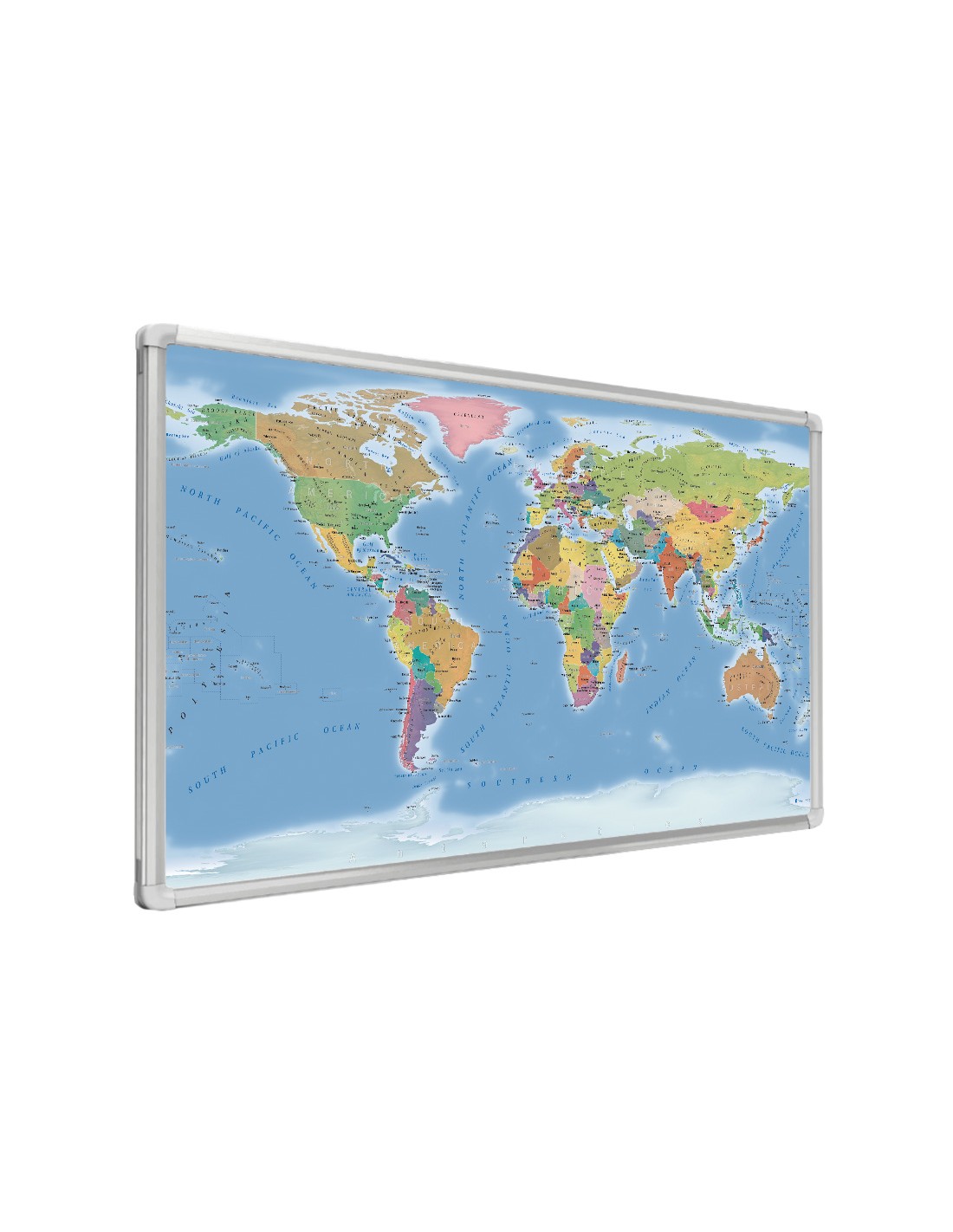Mappa del Mondo MAGNETICA SU BASE IN METALLOVersione Politica e FisicaDimensioni 200x100 cm - Lavagna magnetica- Superficie in metallo- Utilizzabile con magneti di qualsiasi dimensione- Cornice in alluminio anodizzato colore argento- Angoli di protezione in plastica- Kit per fissaggio a muro- Colori brillanti e durata per interni praticamente illimitata....